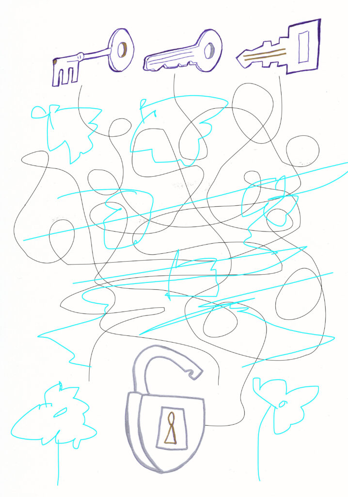 Se på print-arket til post 4 eller på kortet herunder. Hjælp Rapunzella med at finde den rigtige nøgle.
